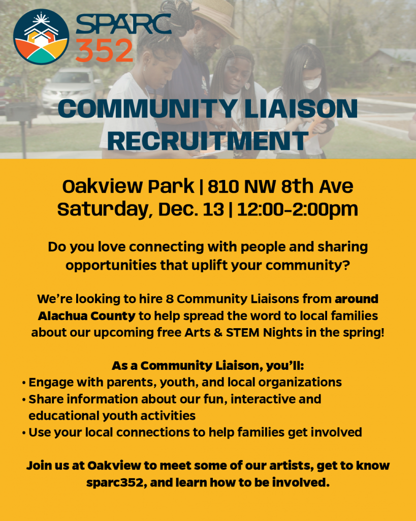We are seeking 8 self-driven community liaisons from around Alachua County (outside of Gainesville) to help spread the word to local families about free SPARC352 Arts & STEM Nights in Spring 2026! These programs will take place in areas outside of Gainesville in areas such as Waldo, High Springs, and more.